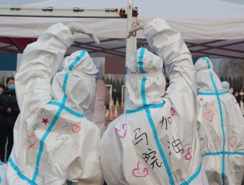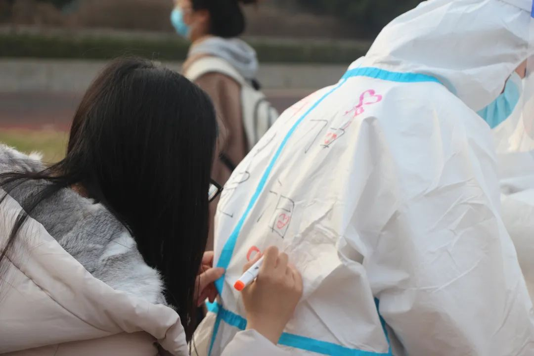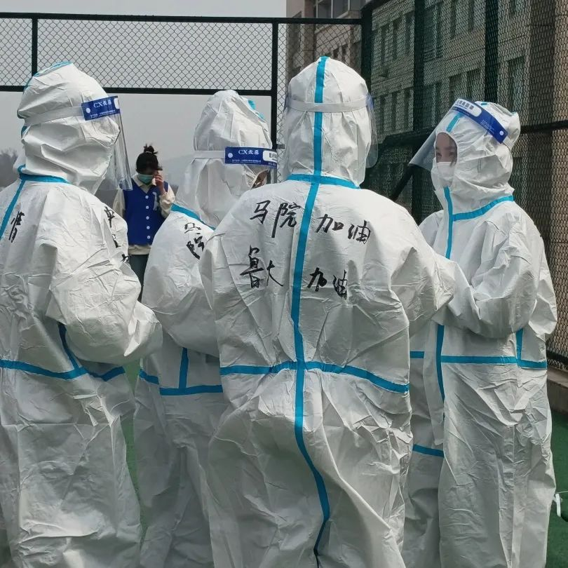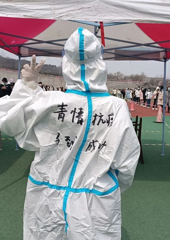 负责教师和学生志愿者们提前来到指定的场地,开始现场布置和相关物品的摆放,根据学校安排分配好任务:一部分同学维护现场秩序,另一部分同学协助医护人员进行核酸检测。正如防护服上的“青”情抗疫,“马”到成功一样,学生志愿者们有序开展相关工作。