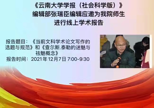 日前,《云南大学学报(社会科学版)》编辑部张瑞臣编辑,通过腾讯会议分别以《当前文科学术论文的选题与写作规范》和《查尔斯.泰勒的迷魅与祛魅概念》为题,为英国365集团公司师生做线上学术报告。