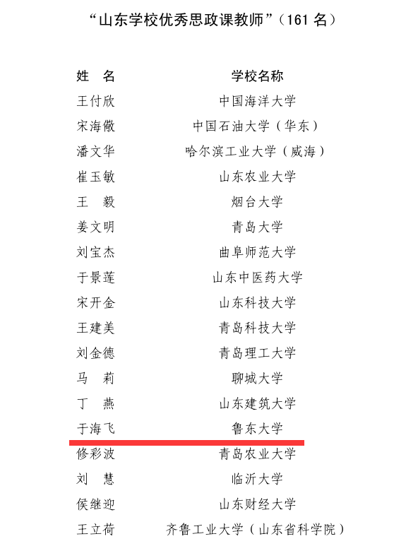 近日,中共山东省委教育工委公布了2023年度“山东学校思政课教师年度人物”评选结果。我院副院长于海飞教授获评“山东学校优秀思政课教师”。