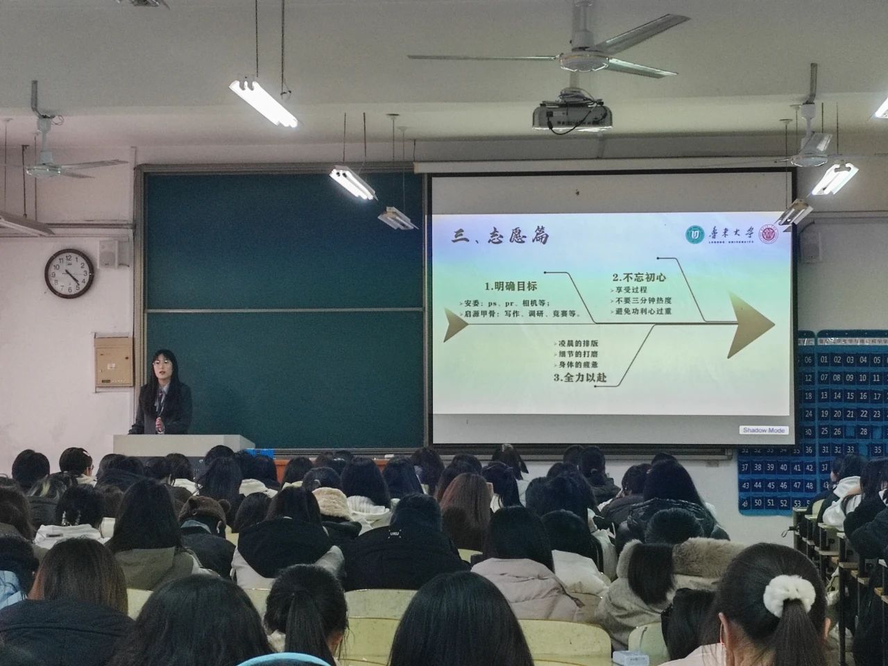 冯文静以"学业规划、创新实践、志愿服务"三大维度为框架,系统阐述个人学习成果、竞赛经历与成长经验。在学业规划方面,结合本科阶段不同学年发展需求,为同学们提供极具针对性的学习建议;在创新实践方面,她结合自身竞赛案例,鼓励同学们积极参与跨学科交流、新文科建设及产学研互动,开拓创新视野;在志愿服务方面,她倡导将专业知识与社会实践相结合,以实际行动服务社会。活动尾声,冯文静结合职业规划激励同学们明确奋斗方向,同学们纷纷表示通过本次活动深化了专业认知,进一步明晰了个人成长路径。