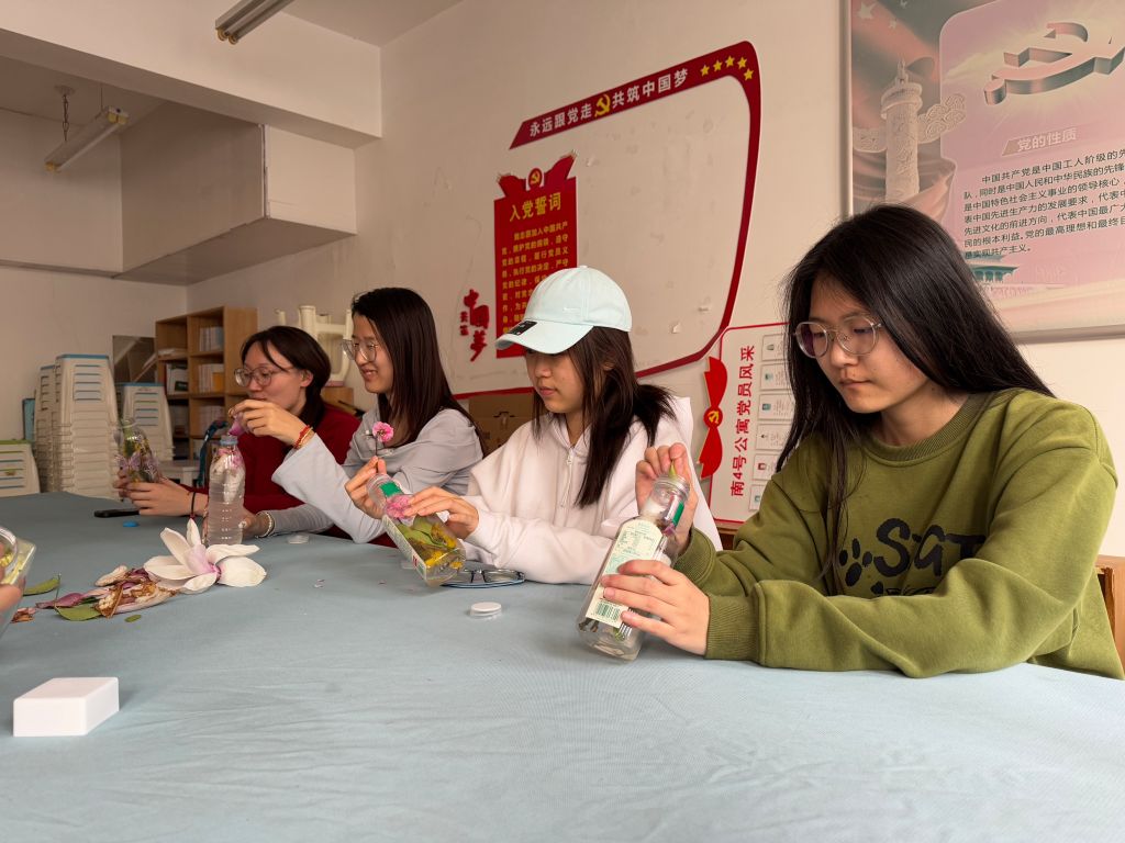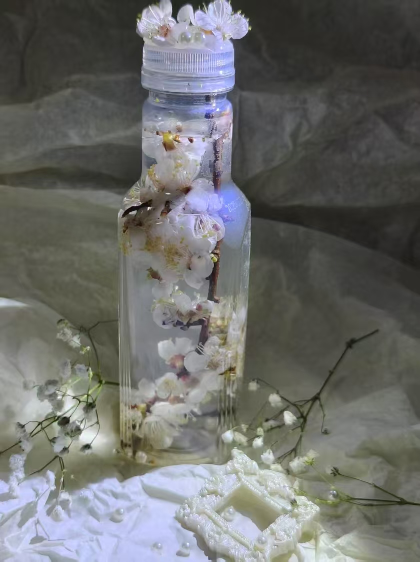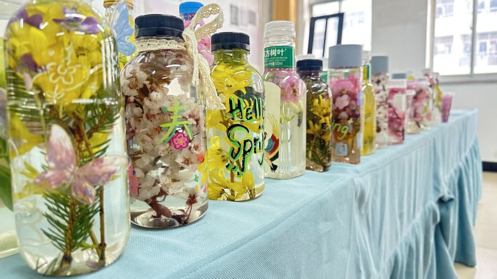 在此次活动的号召下,同学们怀着高涨的热情,有序踏入校园,积极投身“寻春之旅”。同学们以透明瓶罐为媒介,漫步校园,精心收集散落的花瓣与飘坠的新叶,秉持生态美学与创新精神,对自然素材进行解构与重组,将春日的鲜活气息与生态思考凝于方寸之间。这些凝聚着同学们奇思妙想的作品,不仅展现出春天的独特魅力,更成为传递“人与自然生命共同体”理念的生动教材。