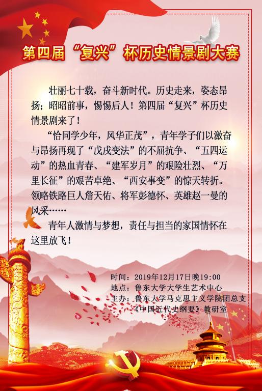 壮丽七十载,奋斗新时代。历史走来,姿态昂扬;昭昭前事,惕惕后人!第四届“复兴”杯历史情景剧来了!