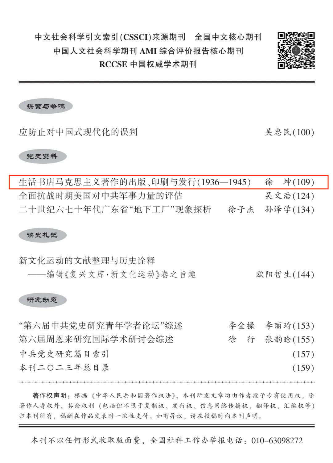 研究中国共产党历史高水平期刊《中共党史研究》2023年第6期“党史资料”专栏刊发我院徐坤博士的学术论文《生活书店马克思主义著作的出版、印刷与发行(1936—1945)》。《中共党史研究》是中共中央党史和文献研究院主管、主办的大型党史权威学术理论期刊,是国家社科基金资助期刊,创刊30余年来,始终坚持正确的政治方向和学术导向,始终坚持以学术为本,为推动中共党史的研究、宣传、教学工作作出重要贡献。