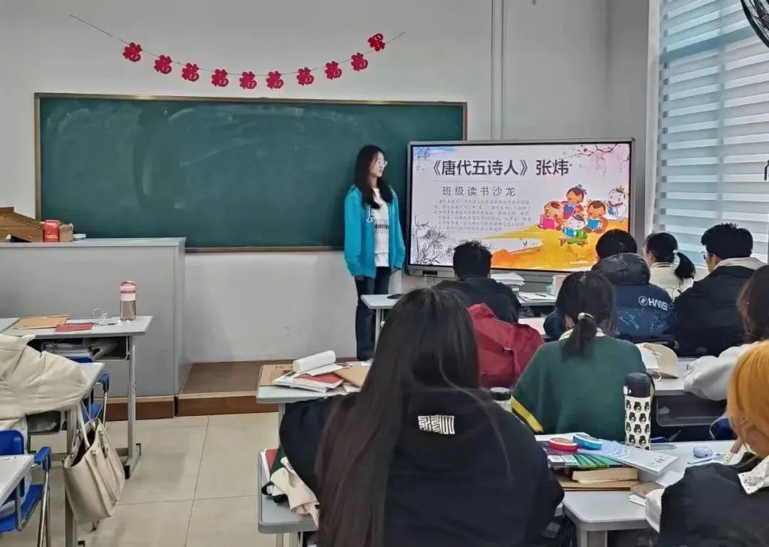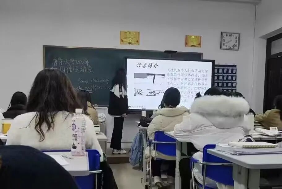 此次沙龙活动选取的书目为茅盾文学奖获奖作家张炜的古典诗论——《唐代五诗人》。作者选取了王维、韩愈、杜牧、白居易、李商隐五位诗人,于历史、人性、哲学、美学、文学史的角度进行判析。张炜老师用极具感染力的文字赋予历史人物以鲜活的生命力,使他们生气勃勃地走到读者面前。活动开始,主讲人播放了《经典咏流传》中相关诗人的片段,激起了同学们极大的兴趣。开场后,主讲人借助纪录片和PPT,生动地讲解着一位位才子的坎坷经历,并结合具体的诗句对诗人的心理、性格与写作意图进行了分析。同学们不仅认真记录笔记,还积极地与主讲人进行互动。其中,在谈到“白居易中唐时期为何遭遇贬谪”时,2204班种淑晗同学回答道:“中唐时期的社会是一片丛林,要想生存,需遵循丛林法则,即学会隐藏自己。而同时期的白居易处于想揭露、想改变社会的状态,这无疑会成为窥视者攻击的活靶子,最终被小人谗言所害。”最后,在分享阅读感悟的环节中,同学们纷纷表示,他们仿佛走进了诗人的内心,悟其所思,愤其所历,悲其所归,真真正正地看到了诗人眼中的世界。