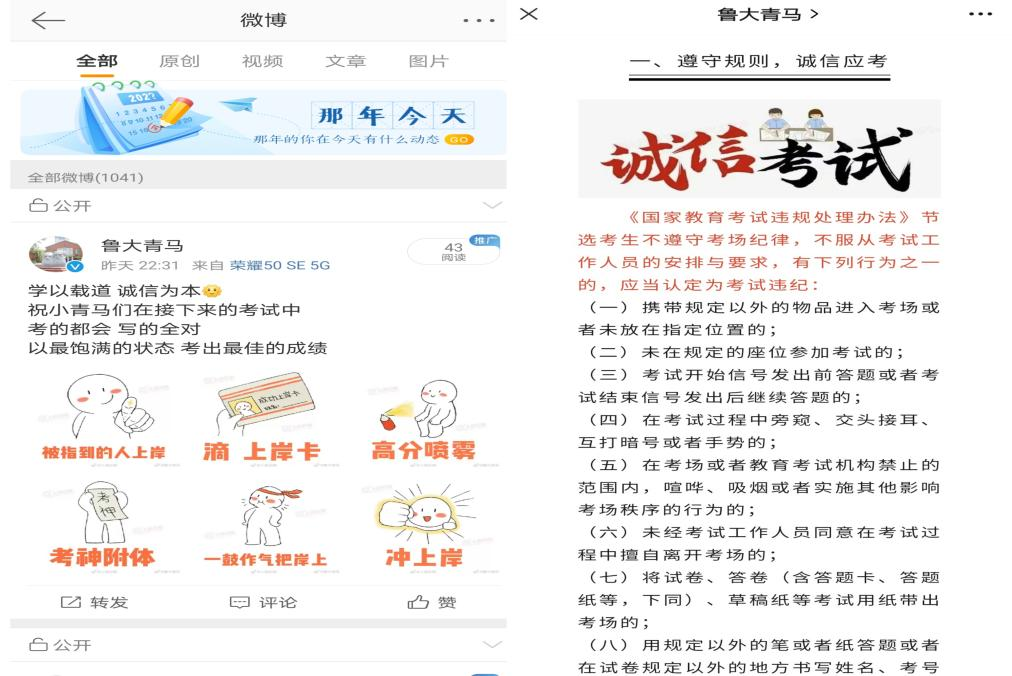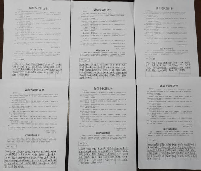学院组织全体学生签署诚信考试承诺书,有效强化了对考生的思想警醒和纪律警示;在考前充分利用公众号、官方微博等平台,针对诚信考试相关内容进行推送,呼吁同学们以诚信为荣,以作弊为耻,摒弃侥幸之念,牢记诚信考试。