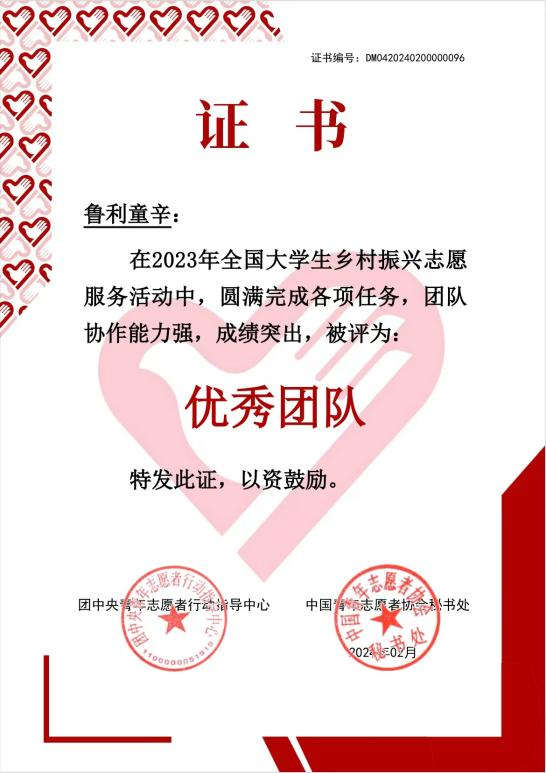 近期,团中央表彰了一批在2023年暑期社会实践活动中表现突出的优秀集体、个人和项目。我院鲁利童辛志愿服务队喜获“2023年全国大学生乡村振兴志愿服务‘优秀团队’”荣誉称号。