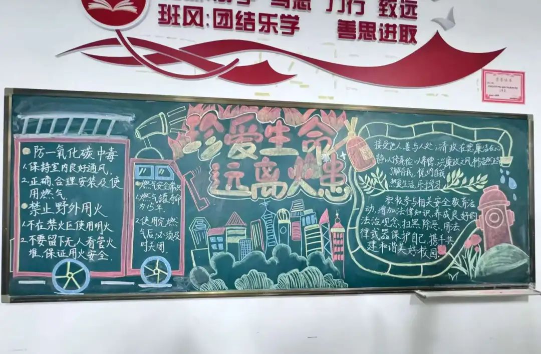学院组织2024级各班同学开展消防安全主题班会,帮助同学们了解火灾的危险性,提高消防安全意识。会后同学们积极参与消防安全黑板报绘制大赛,展现出同学们对校园安全的高度责任感。