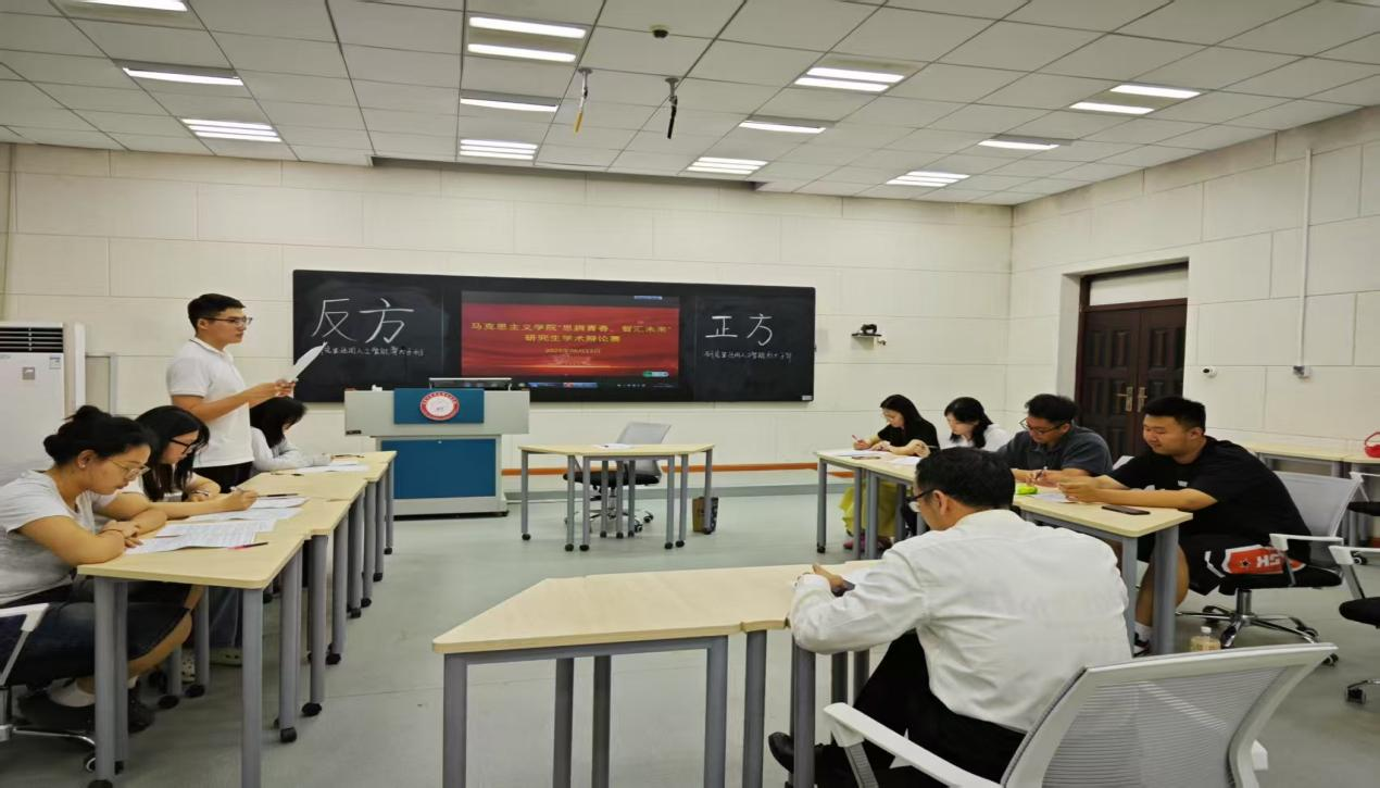 为引导我院研究生深入探讨人工智能在高校研究生群体中的利弊,培养学生的思辨能力和团队协作精神,6月13日,我院于南区一号教学楼218教室举办了以“思辨青春,智汇未来”为主题的研究生辩论赛,本次辩论赛由我院专硕研究生王佳美担任主持人,宋开友老师担任评委,8位学硕和专硕研究生组成正反两方,展开精彩辩论。