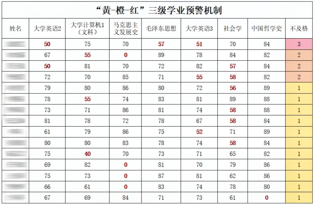 在铸魂育人进程中,学院前瞻性系统打造“预警雷达-干预导航-成长罗盘”三位一体、层层递进的三级学业防护系统,依据学生挂科数量及潜在的学业风险程度,建立“黄-橙-红”三级预警响应机制。通过动态管理系统,实现对学生学业状况的实时跟踪、深度剖析,为学生提供个性化学习指南。在此基础上,该机制针对挂科多门学生,启动“家长-导师-辅导员三方沟通”机制,深度强化家校协同育人效能,精准聚焦、靶向施策,助力学生有效突破学业瓶颈,实现学院学生学业发展的良性转变。