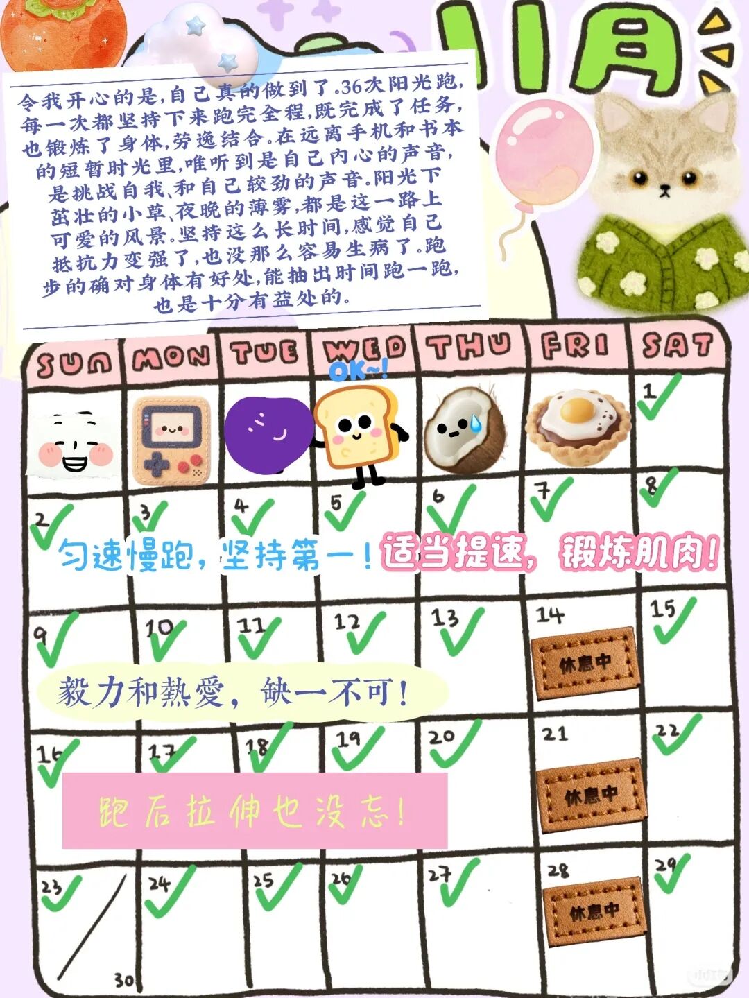 本次“长跑赋能计划”以校园跑为主要活动形式,同时设置了“坚持日志”环节,鼓励参与者记录每日跑步心得与成长历程。学生在每次奔跑过程中,记录下沿途的校园景致、战胜身体倦怠时刻的心境变化,后续学生再将其整理为专属打卡日历或视频。这一活动以身体耐力锤炼为纽带,在持续践行的积累中磨砺耐力,让奔跑中“稳步向前”的坚持自然转化为学业钻研里“深耕不辍”的定力。