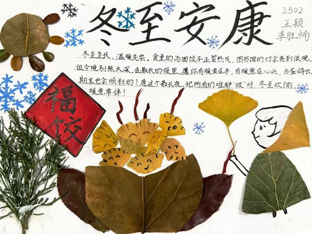 此次“一站式”学生社区文化活动,既为同学们提供了亲近自然、施展创意的平台,更让传统冬至文化在校园中焕发新的活力。同学们在实践体验中领略了节气文化的魅力,在互动交流中增进了彼此情谊,也为学院的文化建设增添了生动色彩。(撰稿:刘雅琪 李甜甜 审核:于海飞)