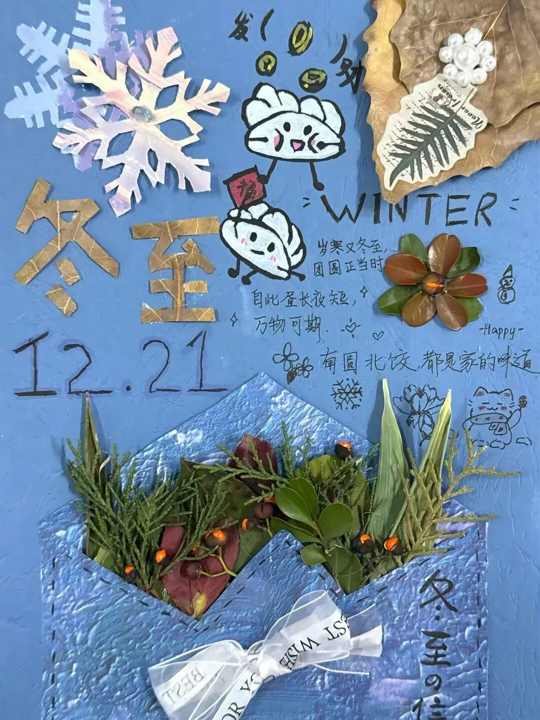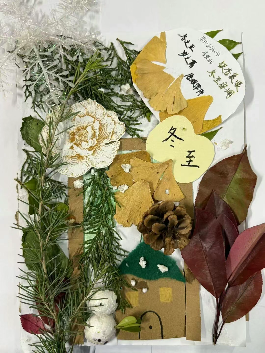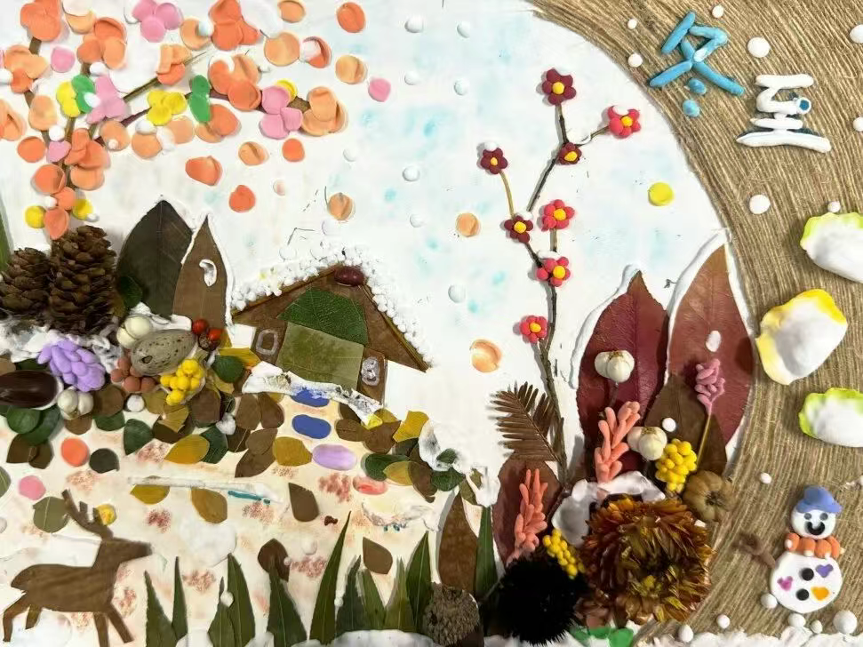 “校园冬日拾趣”创意拼贴活动现场热闹非凡。同学们化身“自然寻宝人”,构思冬至拼贴作品的创意,用自然元素诠释冬日意蕴。这些看似普通的树叶元素,在同学们的奇思妙想与巧手创作下,变成了一幅幅精美的冬至主题拼贴画。同学们还在作品旁写下真挚的祝福语,与拼贴画中的落叶、枯枝相映成趣,让温暖在画中自然流淌。
